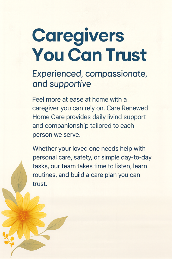 At Care Renewed Home Care, our mission is to help each person live with dignity, comfort, and as much independence as possible in the place they know best—their own home. We walk alongside families with practical support, clear communication, and genuine compassion.